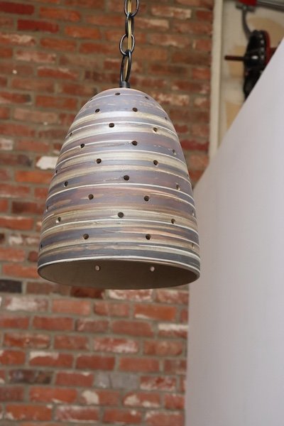 Beehive-form perforated stoneware shade with swirl pattern in attractive matte earth tone hues of brown, reddy-brown, cream, and taupe .