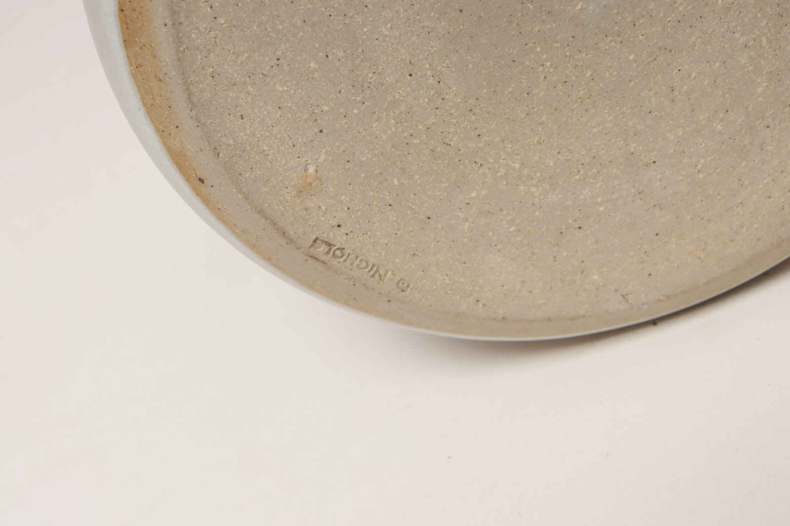 This piece dates to the early 1990s, based on the signature “D. Nichols,” which she used during that era and features a design reminiscent of the linear pattern and shape of certain sea shells. The rim decorated with incised sinuous lines protrudes out slightly from the vessel. Attractive pale gray color with soft blue rim and navy accents.