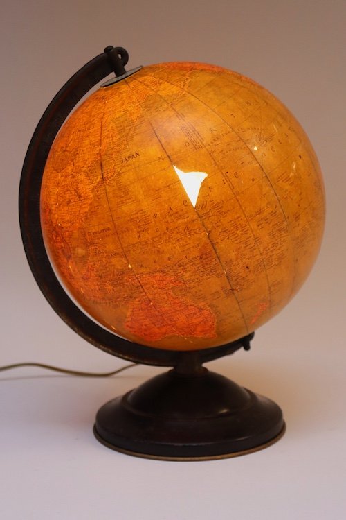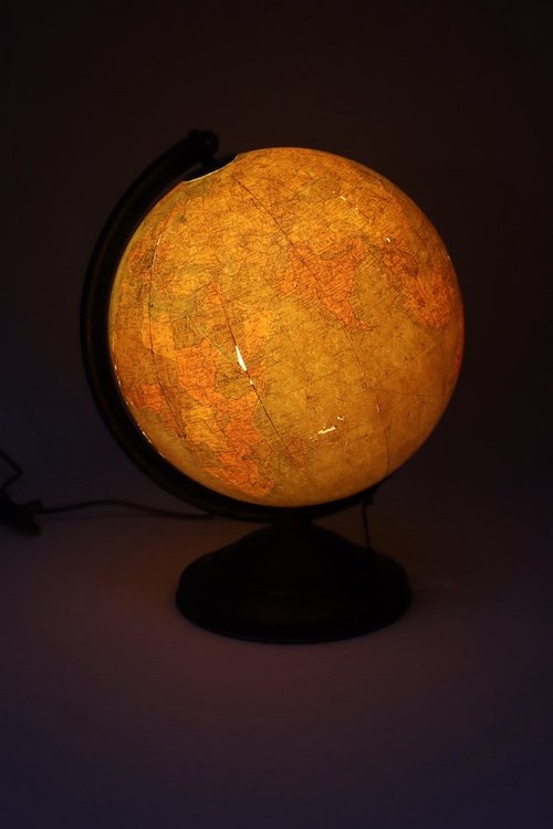 Charming desk / bedside decorative object, given its size (roughly 2″ smaller – width, depth, and heigh, than a typical globe), offering a warm light source.