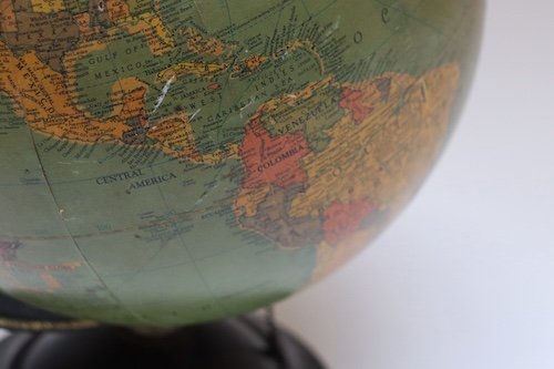 Spots of paper loss present (one significant section in the North Pacific Ocean) and general wear to the globe itself, along with scuffs/oxidation to the metal elements .
