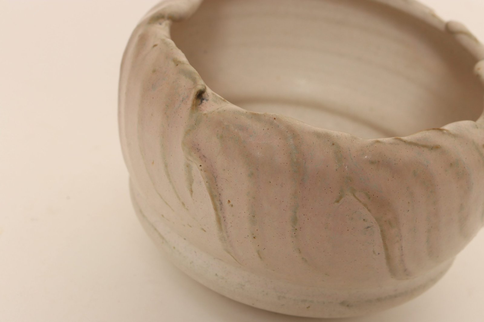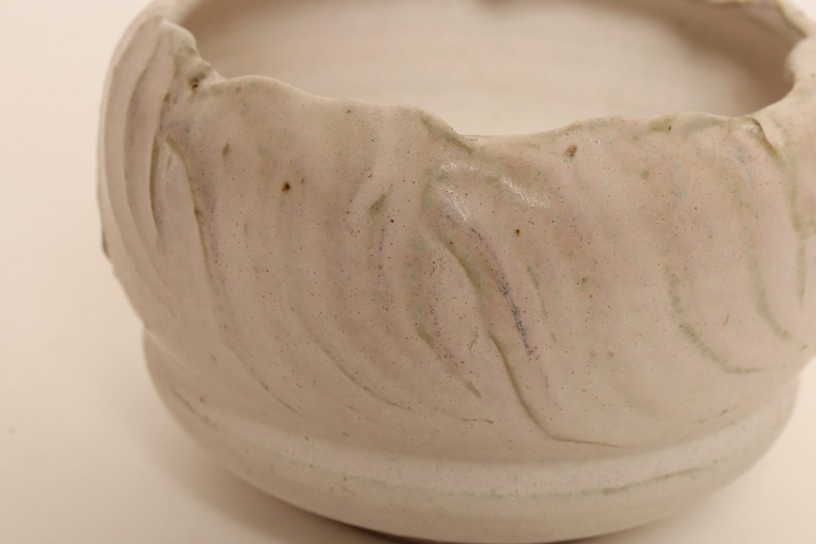 This circa 1979 studio piece possesses a subdued, organic form with attractive colors of pale pink, light green, and brown featuring a design with incised sinuous lines reminiscent of the linear pattern and shape of certain sea shells.