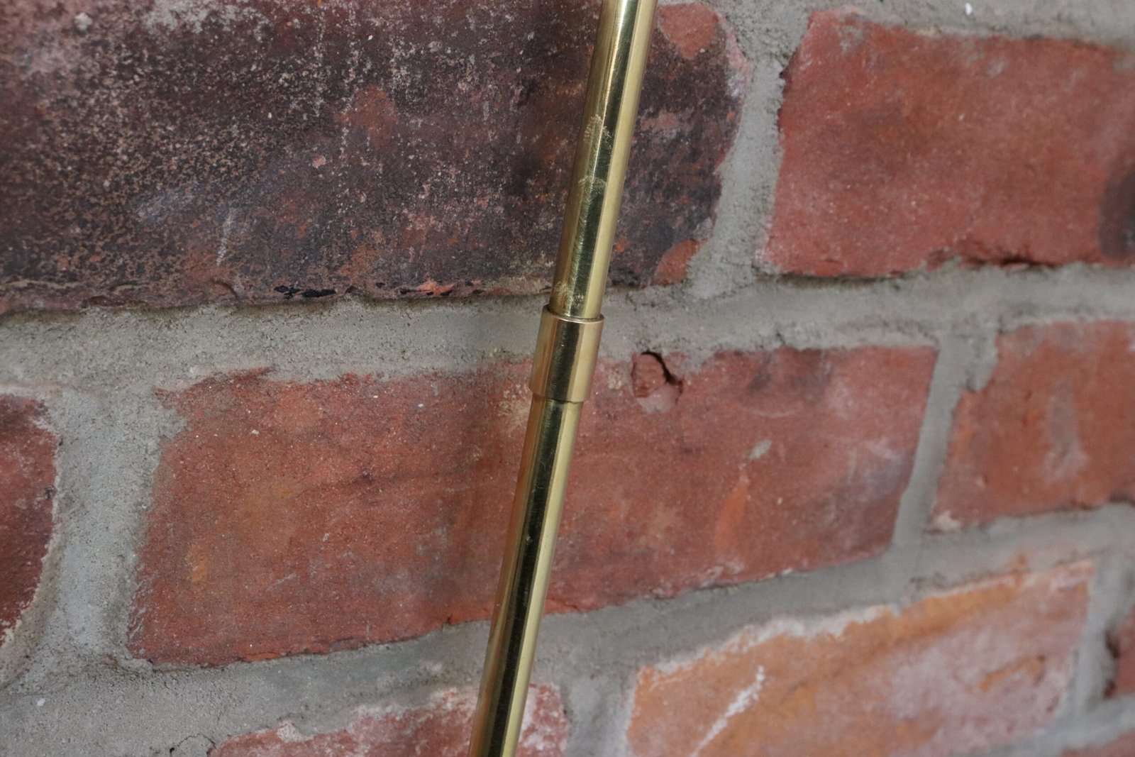 Vintage swing arm lamp in brass by Chapman (ca. 1970s, USA). Composed of a round wall bracket supporting both arm/shade and brass drop down stem comprising two tubular brass ‘poles’ attached via a coupler. One stem or both can be used, adding either 15″ or 30″, respectively to the height of the fixture.