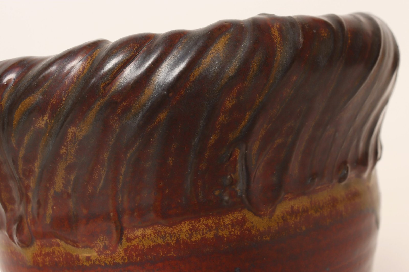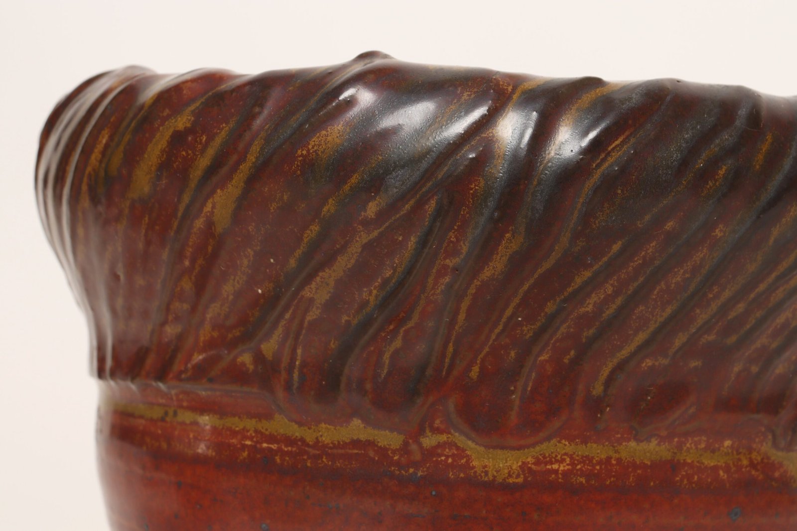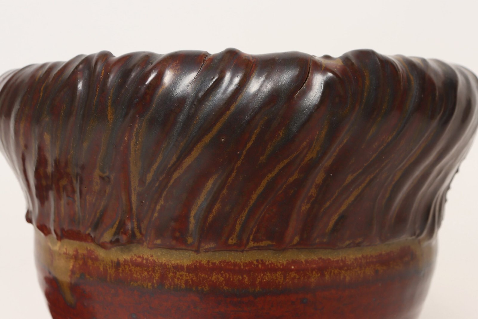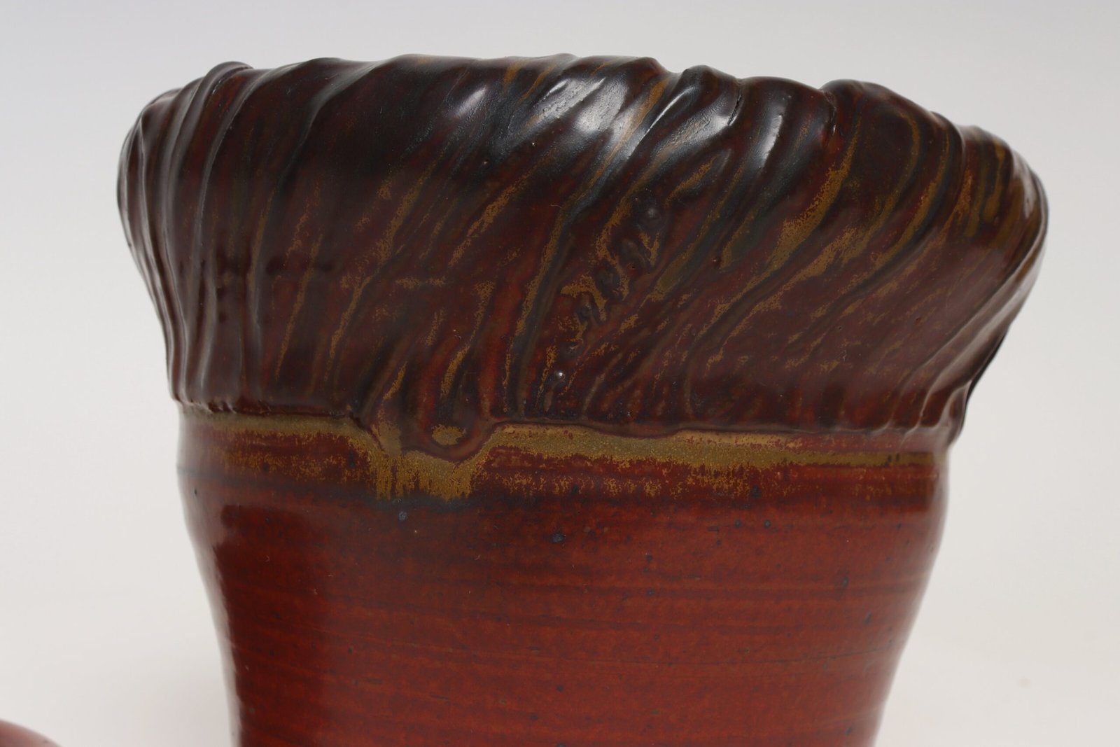This piece dates to the early 1990s, based on the signature “D. Nichols,” which she used during that era and features a design reminiscent of the linear pattern and shape of certain sea shells. The rim decorated with incised sinuous lines protrudes out slightly from the vessel. Attractive deep crimson glaze with ochre and slate rim in both matte and contrasting metallic glazes.