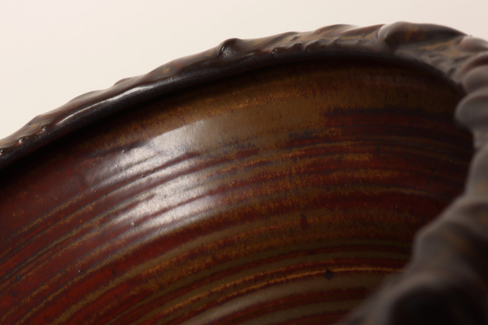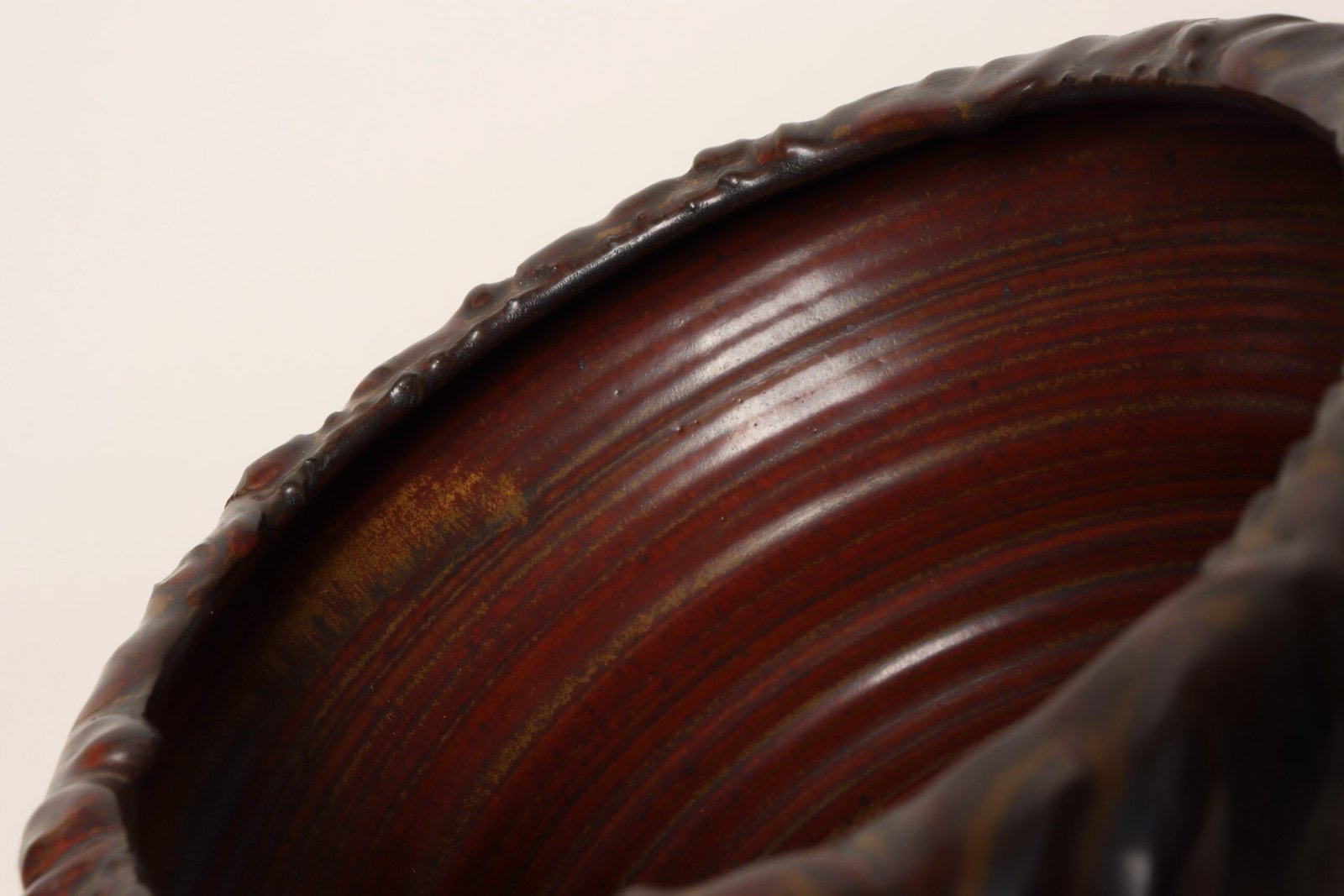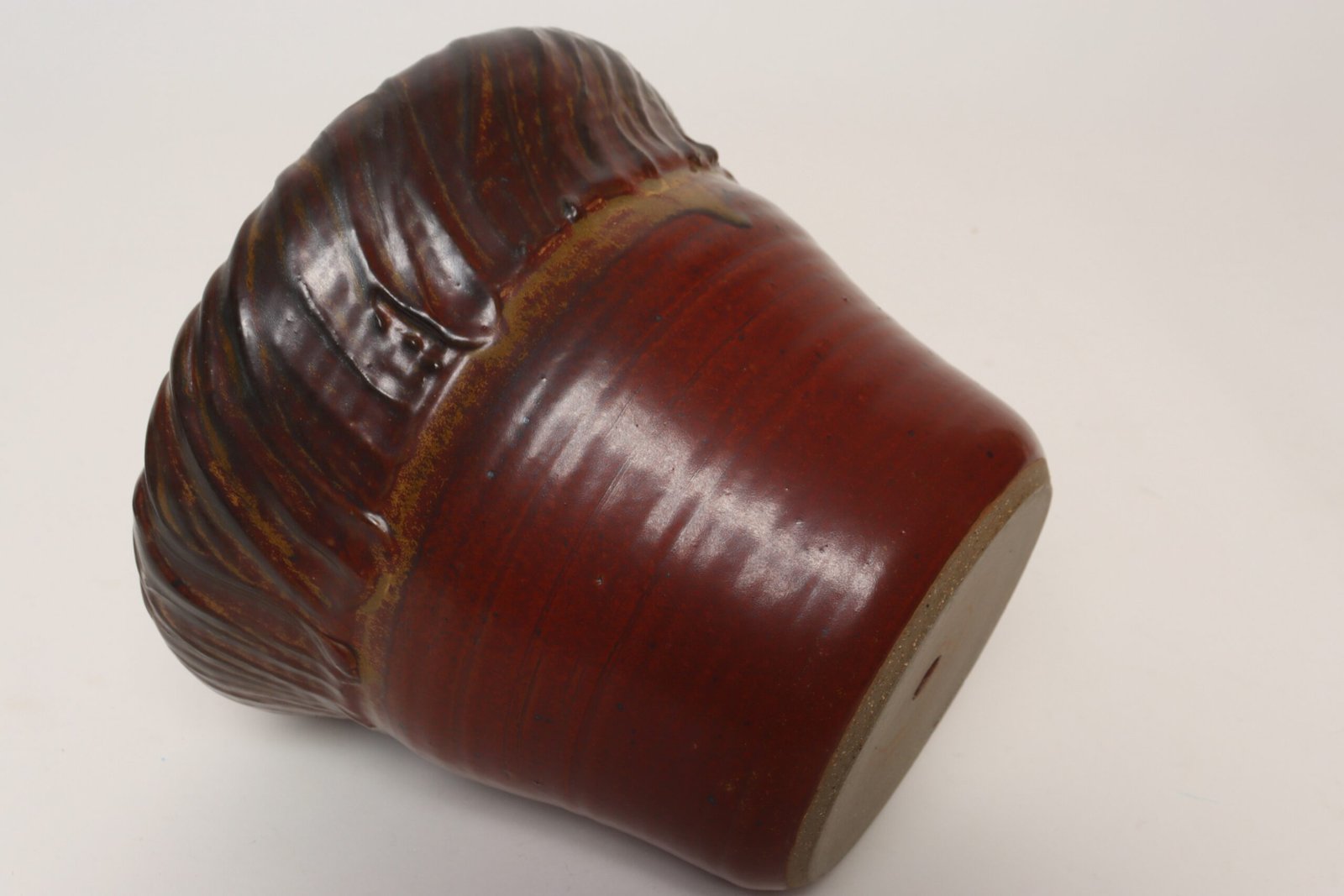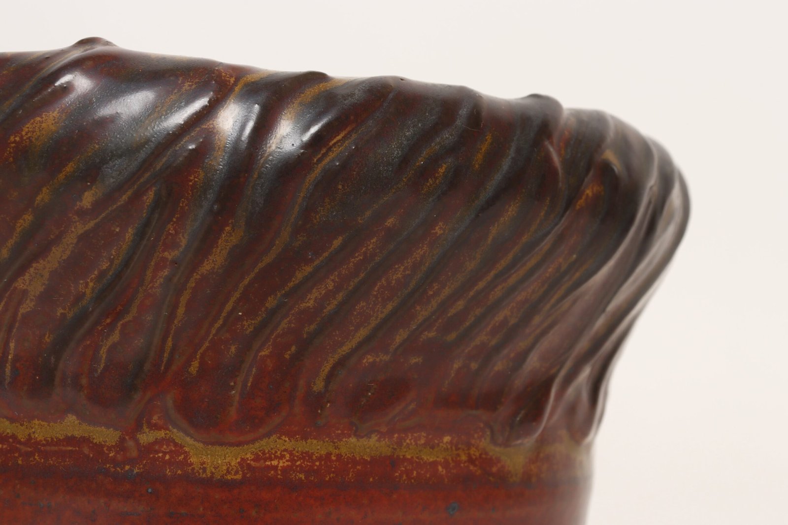 This piece dates to the early 1990s, based on the signature “D. Nichols,” which she used during that era and features a design reminiscent of the linear pattern and shape of certain sea shells. The rim decorated with incised sinuous lines protrudes out slightly from the vessel. Attractive deep crimson glaze with ochre and slate rim in both matte and contrasting metallic glazes.