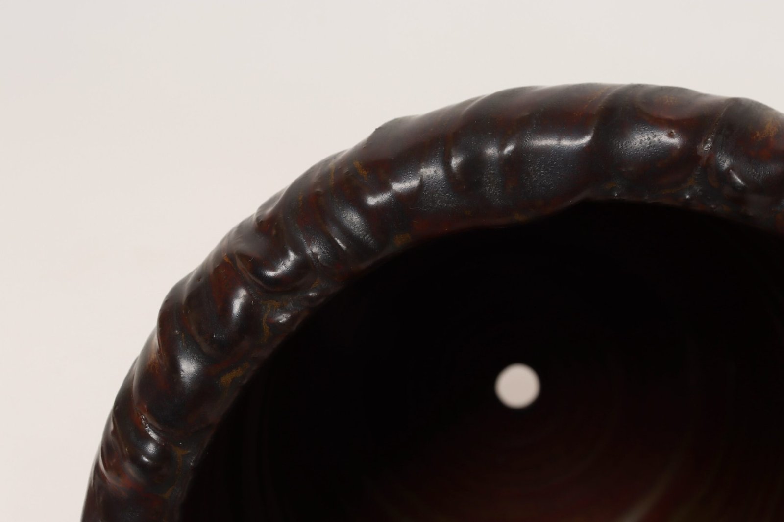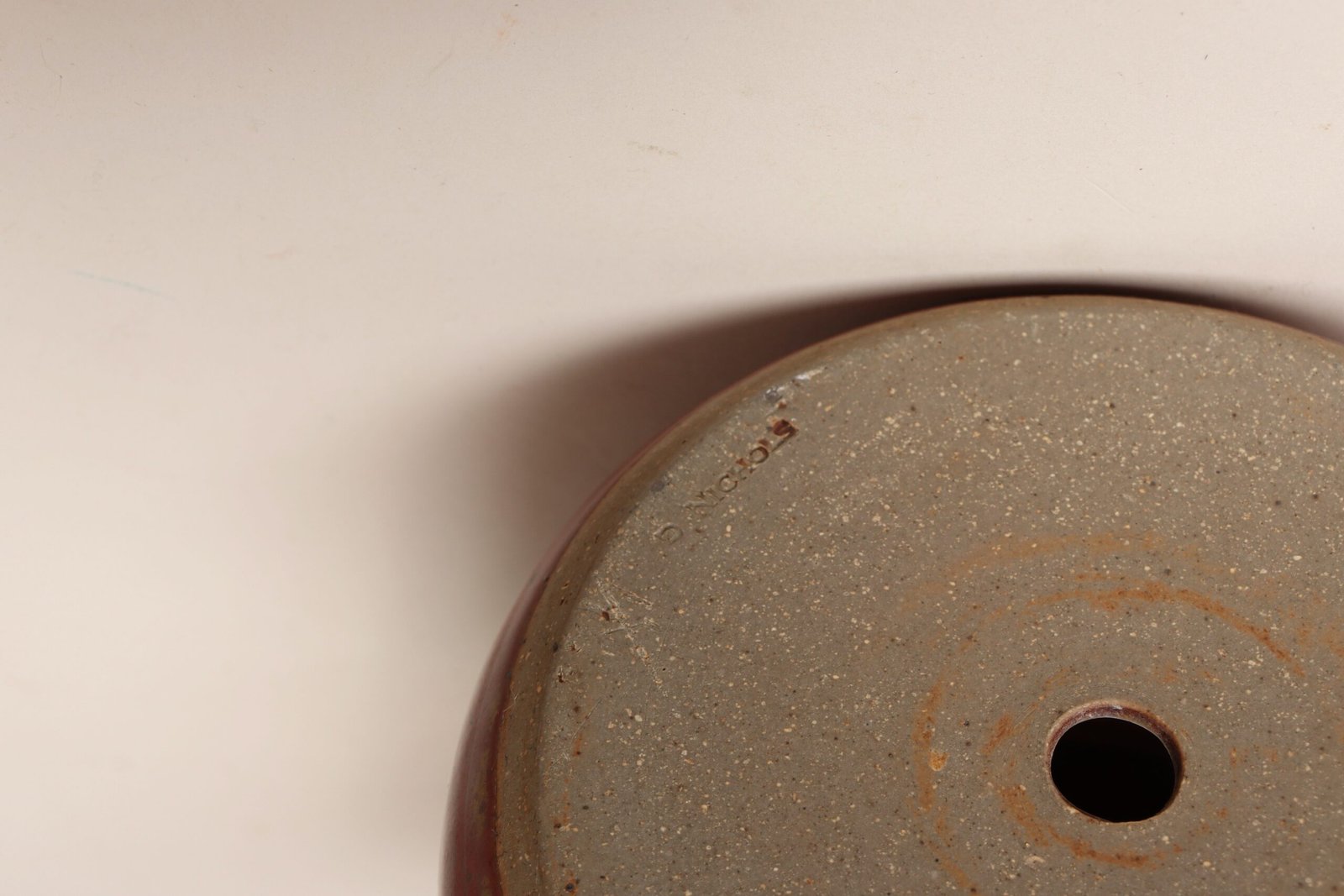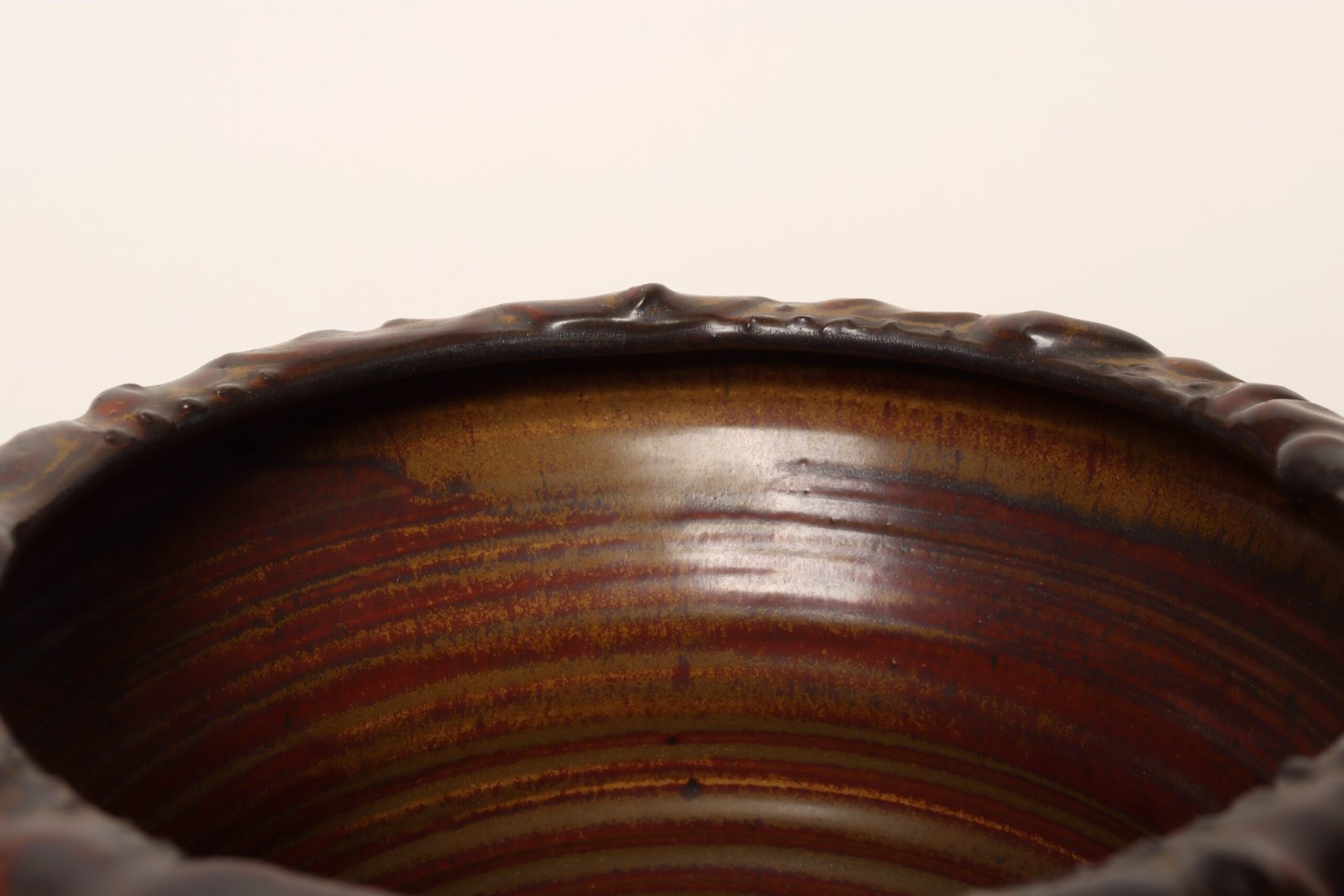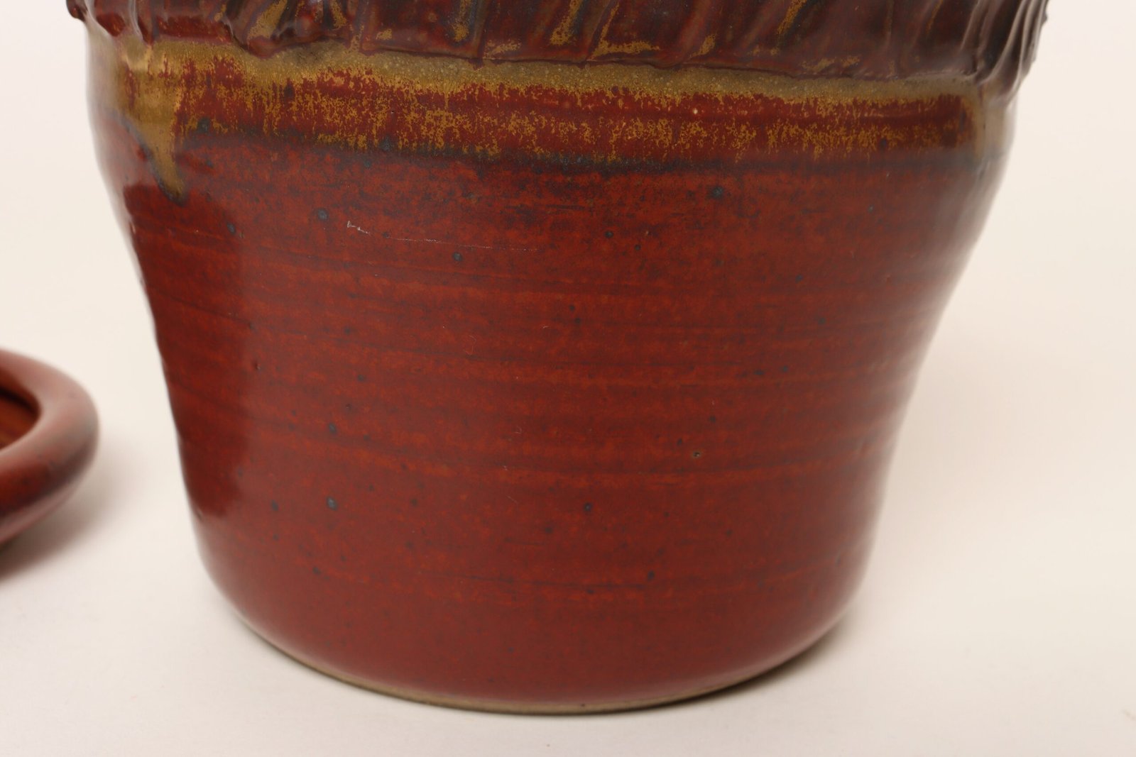 This piece dates to the early 1990s, based on the signature “D. Nichols,” which she used during that era and features a design reminiscent of the linear pattern and shape of certain sea shells. The rim decorated with incised sinuous lines protrudes out slightly from the vessel. Attractive deep crimson glaze with ochre and slate rim in both matte and contrasting metallic glazes.