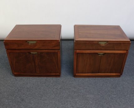 Luxurious Hendredon nine-drawer chest of drawers/dresser (ca. 1970s, USA). Composed of a richly stained satinwood chest featuring seven long and two short drawers with interlocking brass oval “figure-eight” or “infinity” drawer pulls, all supported by an ebonized bracket-style base.