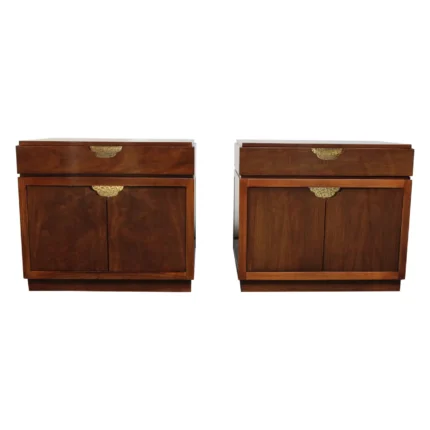 Luxurious Hendredon nine-drawer chest of drawers/dresser (ca. 1970s, USA). Composed of a richly stained satinwood chest featuring seven long and two short drawers with interlocking brass oval “figure-eight” or “infinity” drawer pulls, all supported by an ebonized bracket-style base.
