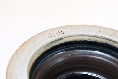 Circa 1979 studio piece featuring a metallic blue glaze with applied dots and incised linear textural elements present.