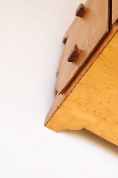 Vintage three-drawer jewelry box/miniature chest in tiger’s eye maple (ca. 1940s, USA).