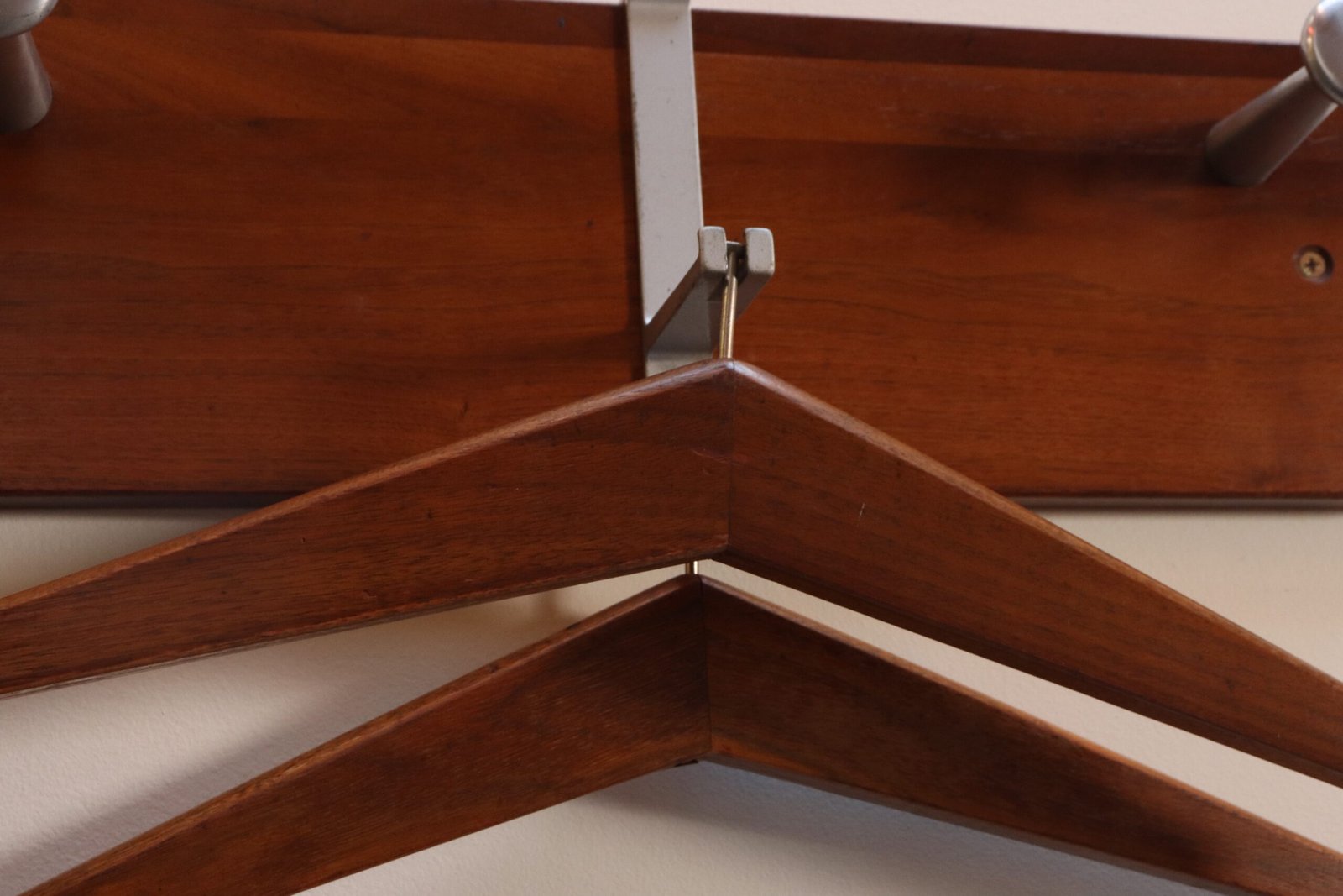 Vintage Walnut and Anodized Aluminum Wall Mounted Coat Rack with Two Hangers