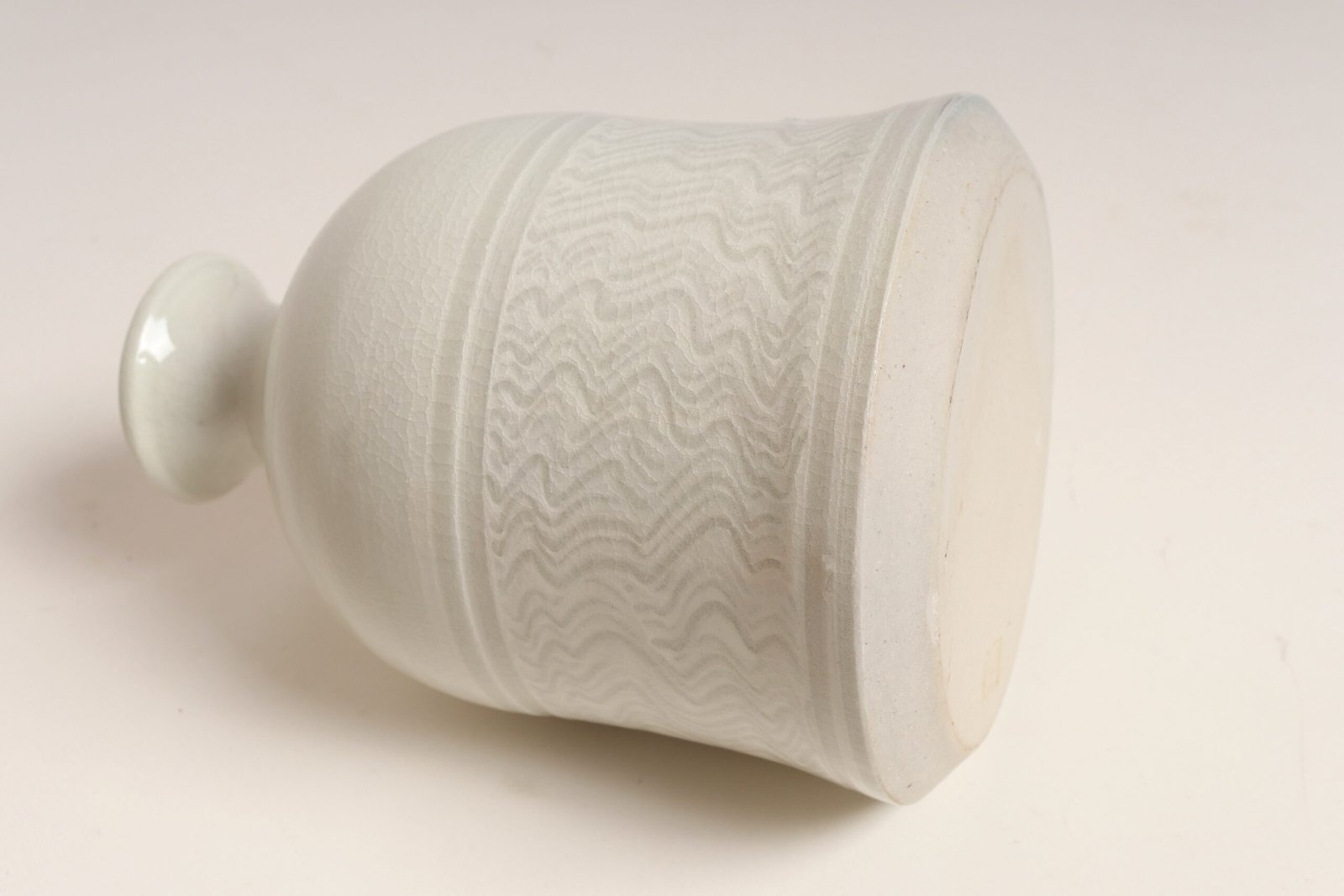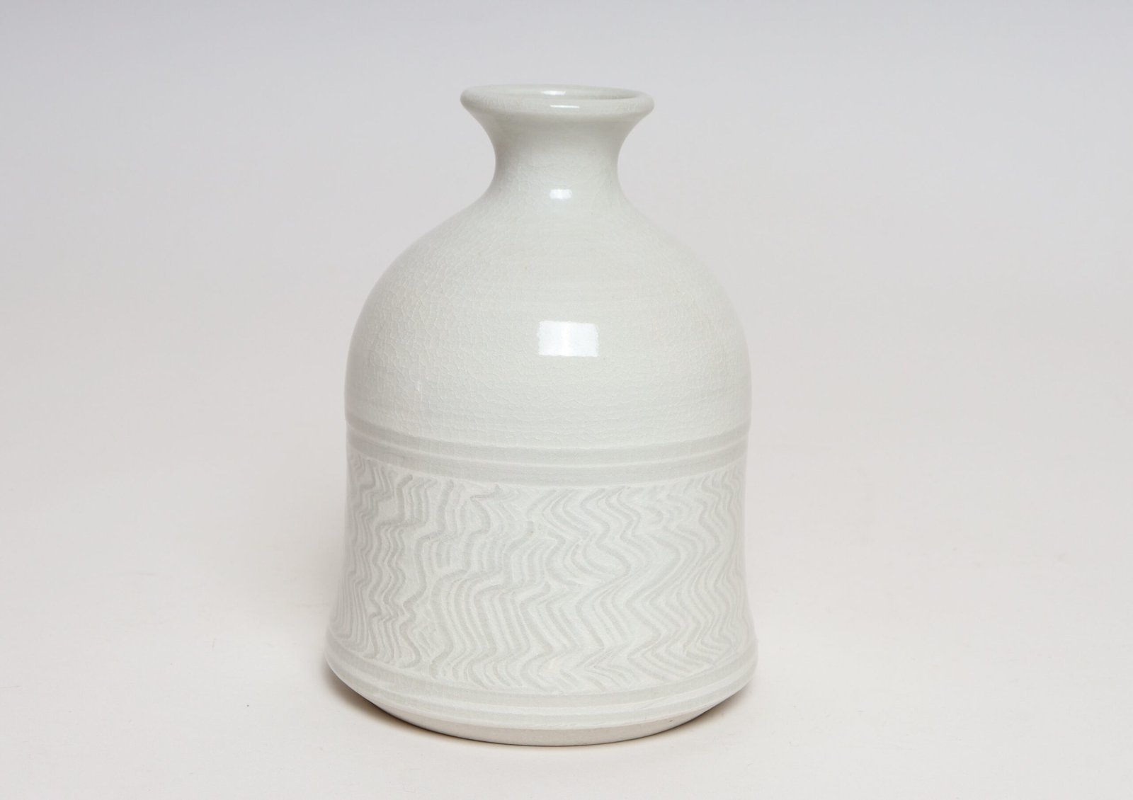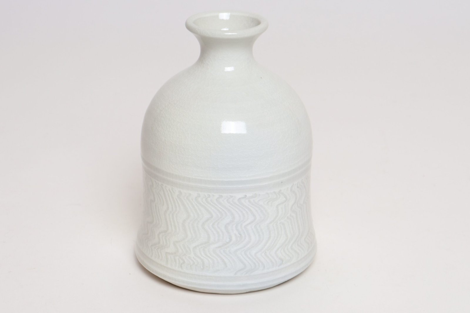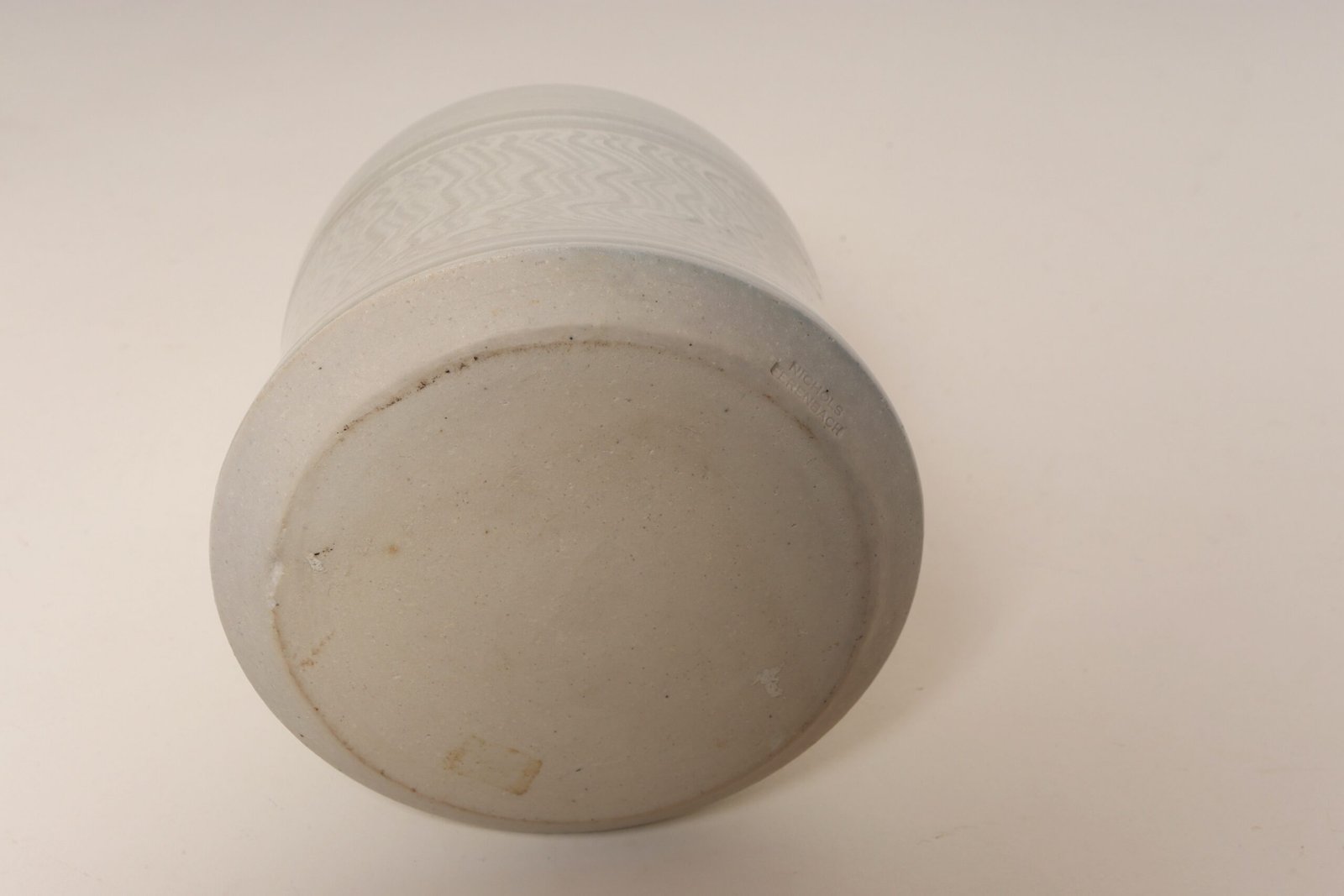 1970s studio piece (works made between 1971-79 were stamped “Nichols Ferenbach”) composed of a glossy white glaze with sgraffito banding and squiggle line decoration. Elegant, sculptural form with no imperfections to note.